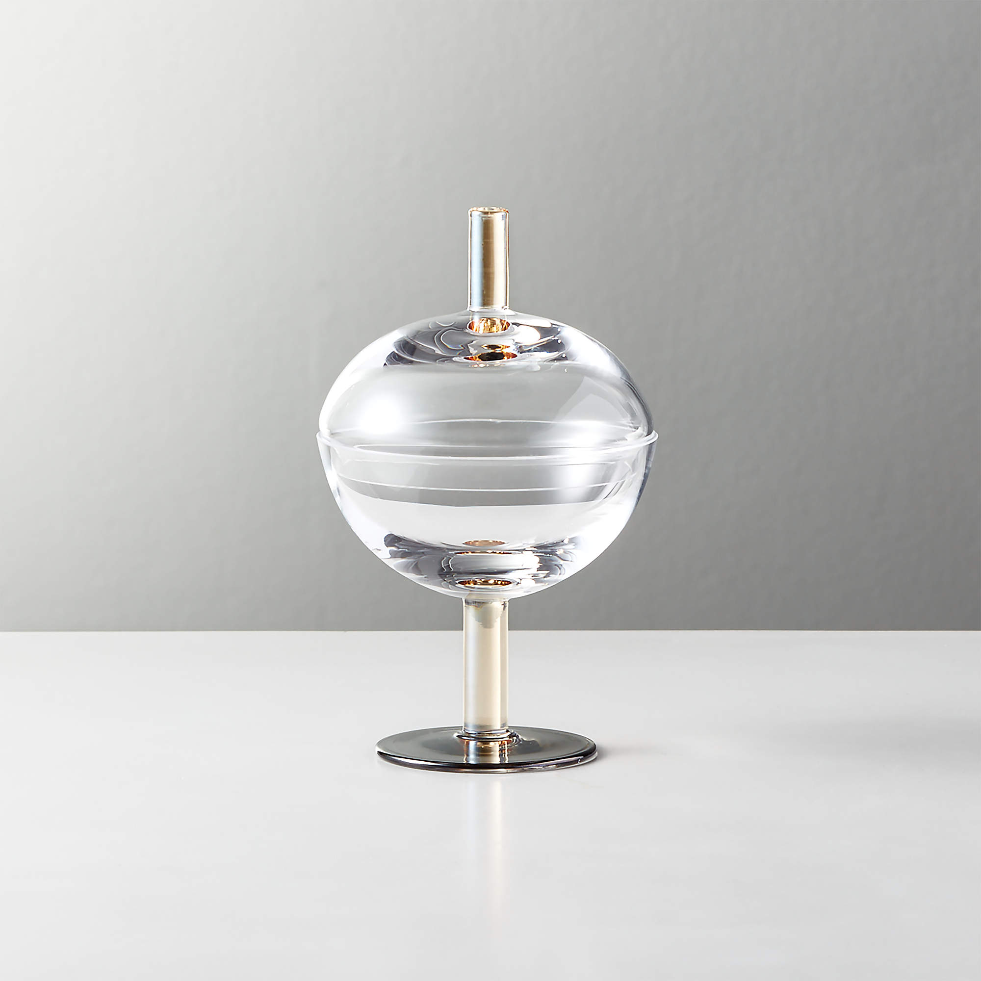 Sweet spot. Handblown smoke-colored glass forms a dish bowl and matching lid floating between sleek amber glass rods.HandmadeColored glassHand washMade in Poland